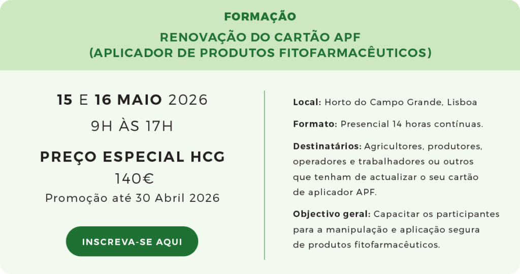 Horto do Campo Grande (HCG) has developed a partnership with Consultactiva, a certified and market-recognised company. Sign up now for our training course that allows you to revalidate your Plant Protection Product Applicator Card (APF).