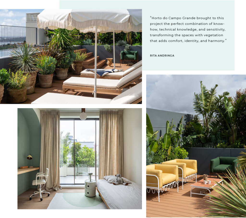 The terrace of this flat has become an extension of the home. Horto do Campo Grande has developed the Horto Collection brand, which offers custom-made planters, with the possibility of choosing the colour desired by the customer. Do you consider products like these to be an asset to interior design studios? How have these solutions helped to transform the outdoor space?