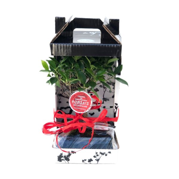 *All bonsais are shipped in the box seen in the photograph, which is closed (to protect the plant during transport), but the front opening is simple as there’s a perforation that allows the “window” to be opened, as shown in the image. The ribbon/card is only sent during festive seasons.
