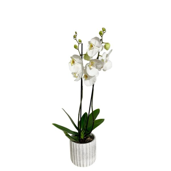 – The orchid photograph shown is of a specimen in stock at the time the product was added to the online catalog, and is therefore a reference. The plant supplied will be white and similar to the photograph, although depending on the stage of its growth cycle, it may vary in appearance (e.g.: different stem height, more or fewer flower buds, with or without flowers, etc.). The height indicated includes the pot shown in the photograph.