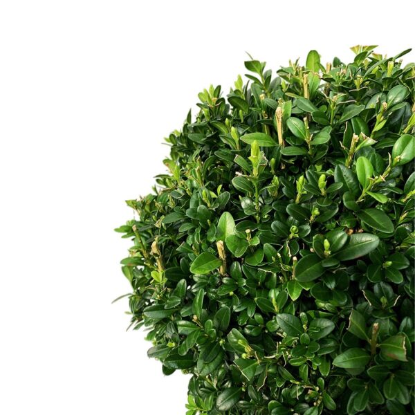 Buxus sempervirens is a slow-growing evergreen shrub, widely used in formal gardens and topiary. The ball shape is achieved through regular pruning that gives it a compact, dense and elegant appearance. It features small, oval, dark green and glossy leaves that remain throughout the year, making it ideal for creating low hedges, borders and decorative pots. Its resilience and ability to be shaped make it one of the most classic ornamental plants in traditional and contemporary gardens.