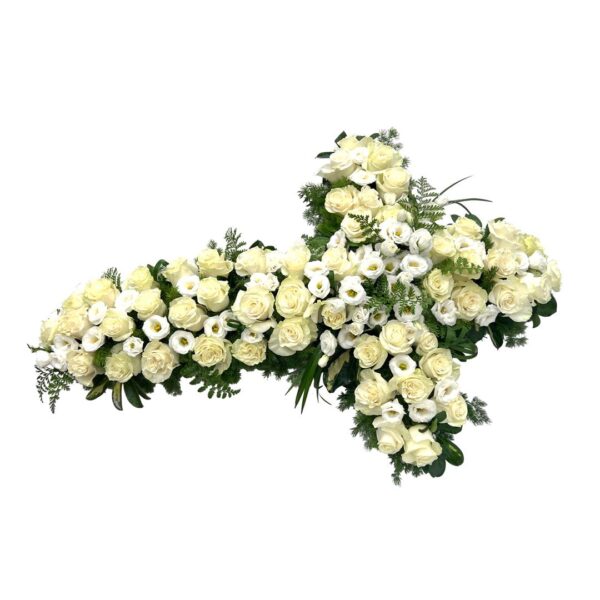 The flower cross symbolises your feelings for the deceased. Express one last feeling of appreciation, thanks and respect. Medium-sized condolence cross in shades of white roses. The arrangement includes a ribbon for your message Please indicate your message of condolence in the “Order Notes” field.