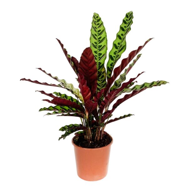 As suas folhas bicolores, verde-claras na parte superior e arroxeadas na parte posterior, fazem da Calathea uma planta muito exótica, ideal para criar um ambiente de alegria e vitalidade na decoração de sua casa. Gosta de mover-se para captar melhor a luz e tem a capacidade de purificar o ar. Pode crescer até 1 metro.