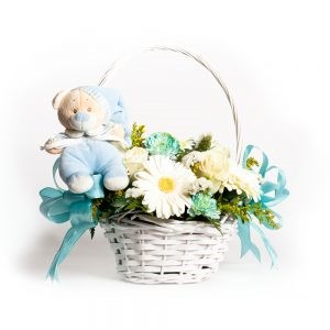 ATENÇÃO! Fotografia representativa – a imagem apresentada é de um exemplar existente em stock no momento da colocação do produto no catálogo online, pelo que é uma referência. O arranjo fornecido será composto por flores disponíveis em stock à data da encomenda, dependendo das espécies disponíveis no momento da compra/estação do ano. A equipa procederá à composição de um arranjo floral com um aspecto natural, leve e alegre, adequado ao tema desta oferta: a celebração do nascimento de um bebé.