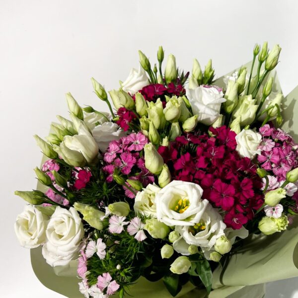 ATENÇÃO! Fotografia representativa – a imagem apresentada é de um exemplares existente em stock no momento da colocação do produto no catálogo online, pelo que é uma referência. O arranjo fornecido será compostos por flores disponíveis em stock à data da encomenda, tendo Lisianthus, mas dependendo as restantes espécies das flores disponíveis no momento da compra/estação do ano. A equipa procederá à composição de um arranjo floral com o aspecto mais próximo/similar ao das fotografias publicadas.