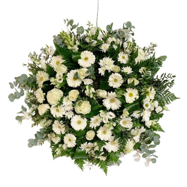 Coroa funerária clássica de flores frescas, em formato redondo, composta por Gerberas e Margaridas em tons branco/creme e verduras. Manifeste um último sentimento de apreço, agradecimento e respeito por quem partiu.