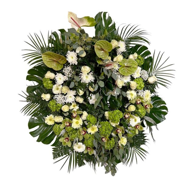Coroa funerária clássica de flores frescas, em formato redondo, composta por Rosas, Hortênsias, Antúrios, Gypsophila, Crisântemos e Gerberas em tons branco/verde/creme e verduras. Manifeste um último sentimento de apreço, agradecimento e respeito por quem partiu.