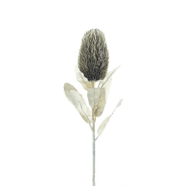 Este pé de Protea, é uma reprodução ao estilo natalício desta espécie botânica. Pintado a spray em tom champanhe, é um elemento ideal para compor as suas decorações e arranjos no Natal ou mesmo ao longo de todo o ano. Sendo a Protea uma flor exótica, e sempre exuberante, irá criar impacto em qualquer celebração/efeméride, ficando bem em qualquer bouquet, jarra, centro de mesa ou decoração que lhe ocorra fazer.