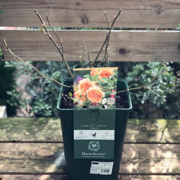 A rosa Dame Judi Dench produz flores com um tom particularmente bonito – damasco-alaranjado – que vai aclarando suavemente em direção às margens. Os botões marcantes, com pontas avermelhadas, abrem-se gradualmente para revelar grandes rosetas informais, com pétalas onduladas e um “olho” central. São muito resistentes aos danos da chuva e as pétalas caem de forma limpa. Exalam uma fragrância de Chá de intensidade ligeira a média. Trata-se de um arbusto robusto, que produz caules fortes e arqueados, formando com o tempo um atraente maciço de flores. Recebeu o nome de Judy Dench, a atriz britânica de grande prestígio, reconhecida no teatro, cinema e televisão, célebre pela sua longa carreira, enorme versatilidade e interpretações marcantes em clássicos de Shakespeare, filmes da saga James Bond (interpretando “M”), entre outros filmes premiados. Com tanta beleza e classe, esta roseira só podia ter o nome de uma senhora tão distinta.