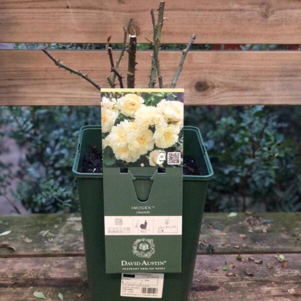 A rosa Imogen produz flores muito bonitas, de cor amarelo-pálido e ligeiramente perfumadas, que desvanecem quase até ao tom creme. As numerosas pétalas delicadamente frisadas estão dispostas em redor de um olho central. Esta roseira forma um arbusto robusto e de porte vertical, com folhagem verde brilhante. Recebeu o nome da personagem da peça “Cymbeline”, de Shakespeare, na qual ‘Imogen’ – a filha do rei Cymbeline e esposa virtuosa de Posthumus – virtuosa e corajosa, sendo o seu papel central envolvido pela lealdade e amor verdadeiro. Imogen representa pureza, fidelidade e força interior, sendo uma das heroínas mais admiradas de Shakespeare. O nome desta roseira só podia ser este.