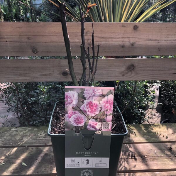 A rosa Mary Delany é uma trepadeira delicadamente bela e bastante invulgar, que apresenta pequenos botões pontiagudos, abrindo em flores de tamanho médio, pouco duplas, de cor rosa clara. Produzidas em grandes cachos abertos ao longo de uma temporada muito longa, as flores surgem em hastes finas e escuras e abrem gradualmente, revelando estames dourados. Possui um perfume leve a médio, característico das rosas antigas, com nuances frutadas. É robusta e quase sem espinhos, com folhas relativamente pequenas e verde-escuras.