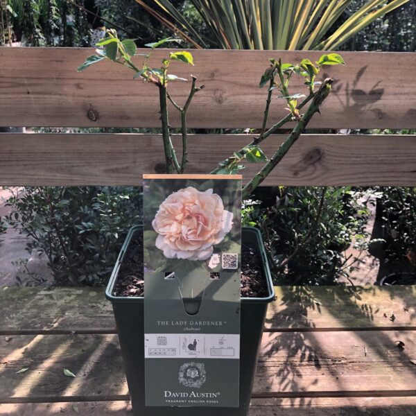 A rosa The Lady Gardener produz grandes rosetas quarteladas, cada uma com cerca de 10cm de diâmetro, densamente preenchidas por pétalas dispostas de forma solta. Apresentam um belo tom de damasco puro, tornando-se mais claro em direcção às margens. Possuem uma agradável fragrância de chá, com notas de madeira de cedro e baunilha. Esta roseira recebeu o nome para promover e sensibilizar as pessoas para o incrível trabalho da “Plant Heritage”, uma ONG dedicada à conservação, estudo e protecção da diversidade das plantas de jardim na Grã-Bretanha, que zela sua preservação para as gerações futuras.