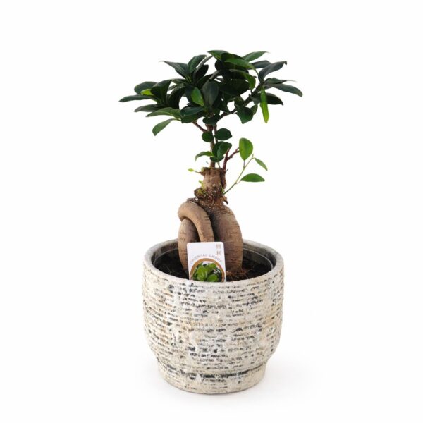 O Ficus Ginseng é uma planta de interior muito apreciada pelo seu tronco robusto e escultural, que lembra um Bonsai, e pela sua copa de folhas verdes brilhantes. É uma planta resistente e de fácil manutenção, ideal tanto para iniciantes como para amantes de plantas. Além da sua beleza, tem a capacidade de purificar as toxinas existentes na pequena camada de ar renovando-o em seu redor. Rodar o vaso ocasionalmente é sempre uma boa ideia pois ajuda a manter um crescimento equilibrado. E evitar excesso de água é a chave para o sucesso!