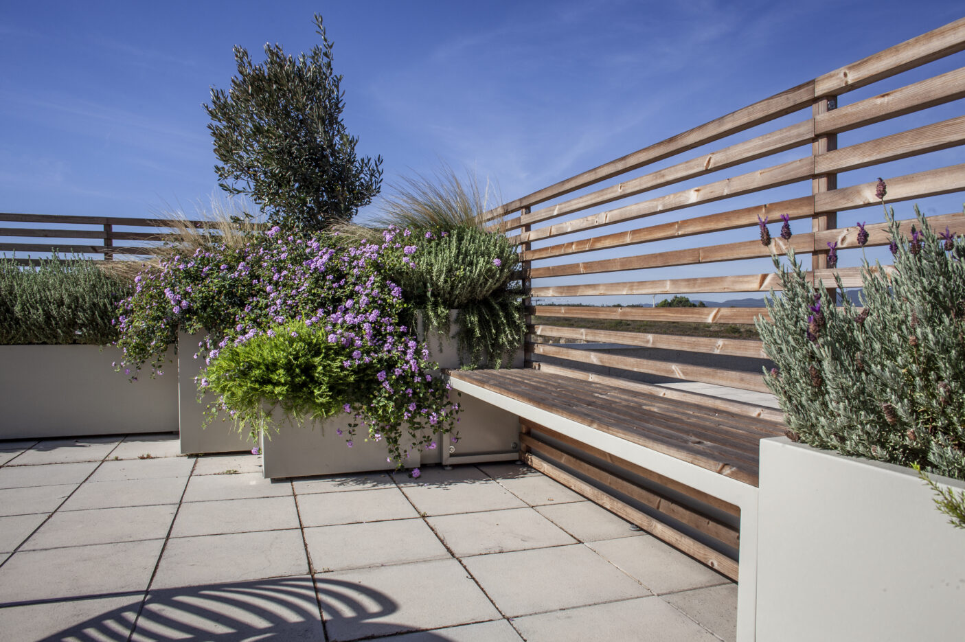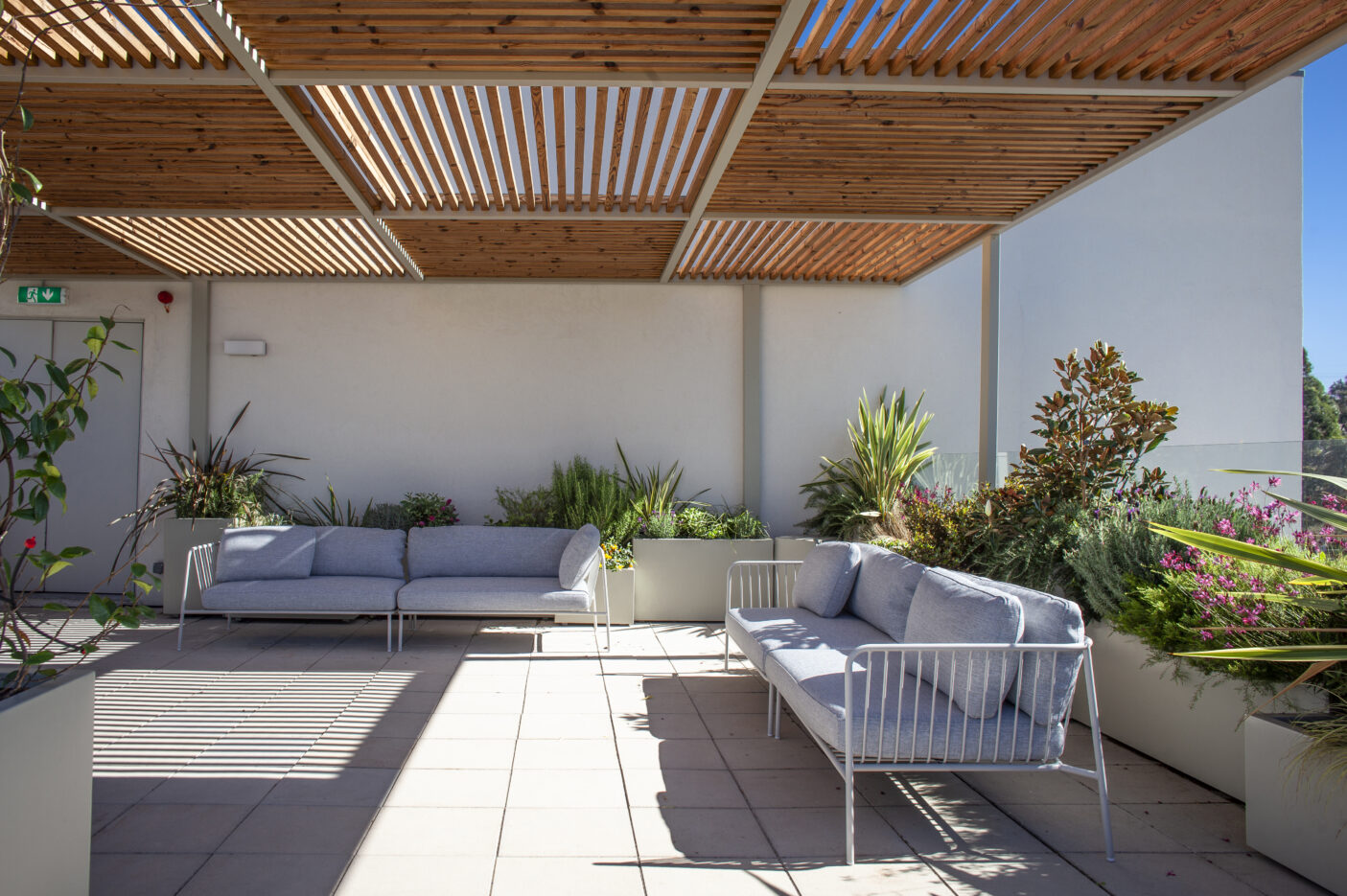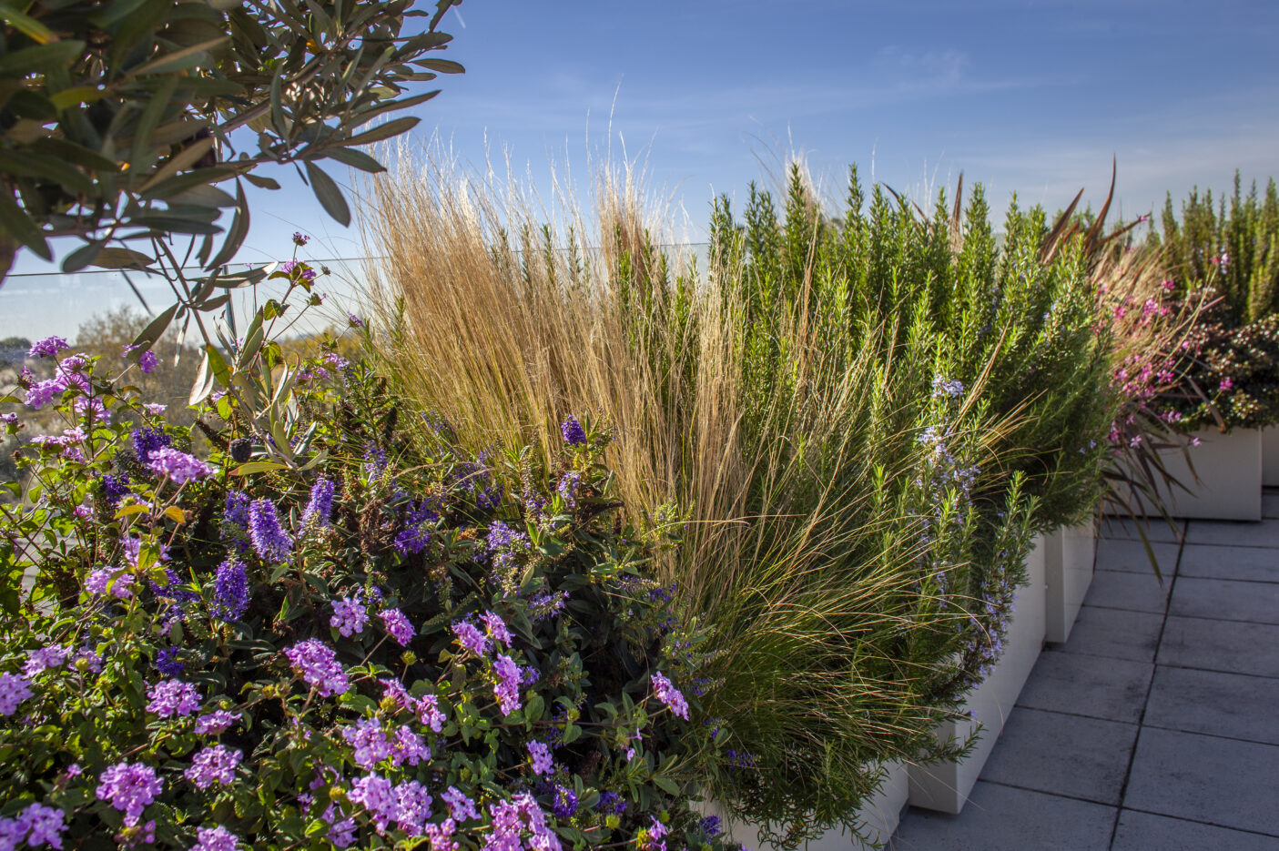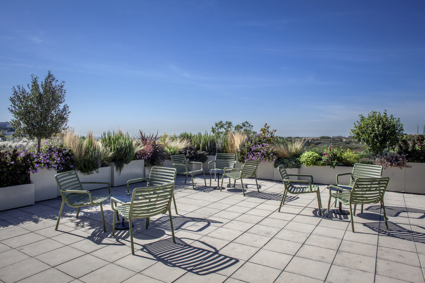 A escolha das espécies vegetais teve como critério principal a resistência ao vento e à exposição solar, características marcantes de um rooftop aberto. Optou-se por plantas mediterrânicas, de baixa necessidade hídrica e reduzida manutenção, assegurando um espaço sustentável e com vida ao longo de todo o ano. As espécies, cuidadosamente selecionadas, introduzem diversidade cromática e textural, com flores em diferentes tons e plantas pendentes que suavizam o limite das floreiras, criando uma envolvente natural e dinâmica.