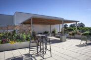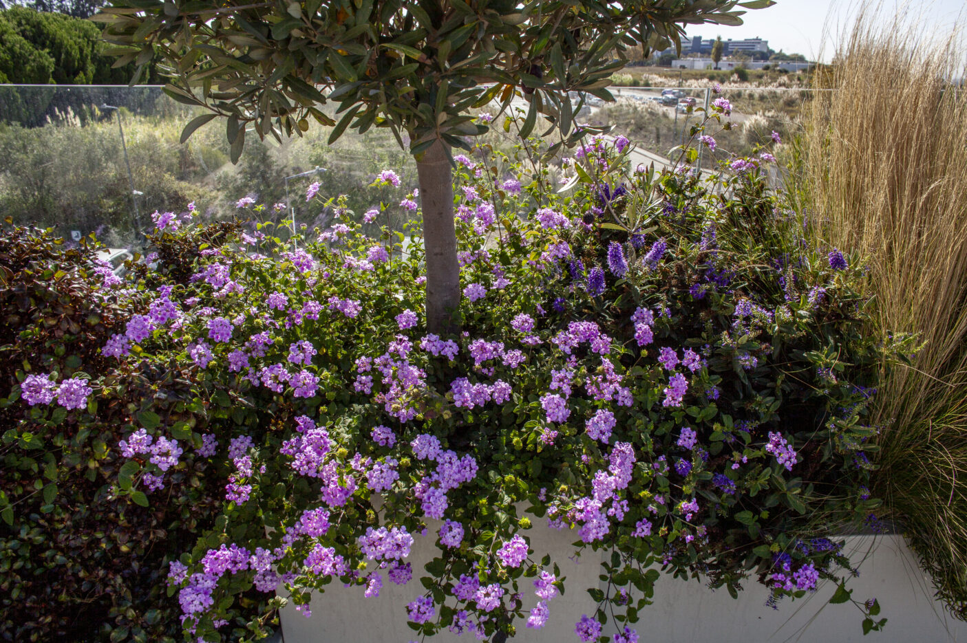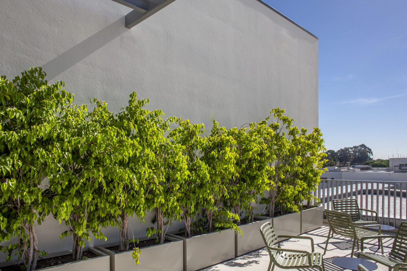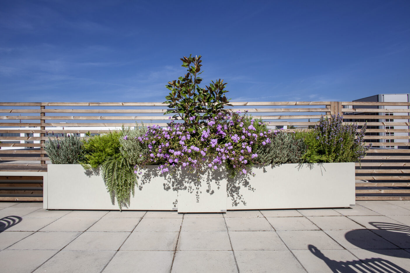 A escolha das espécies vegetais teve como critério principal a resistência ao vento e à exposição solar, características marcantes de um rooftop aberto. Optou-se por plantas mediterrânicas, de baixa necessidade hídrica e reduzida manutenção, assegurando um espaço sustentável e com vida ao longo de todo o ano. As espécies, cuidadosamente selecionadas, introduzem diversidade cromática e textural, com flores em diferentes tons e plantas pendentes que suavizam o limite das floreiras, criando uma envolvente natural e dinâmica.