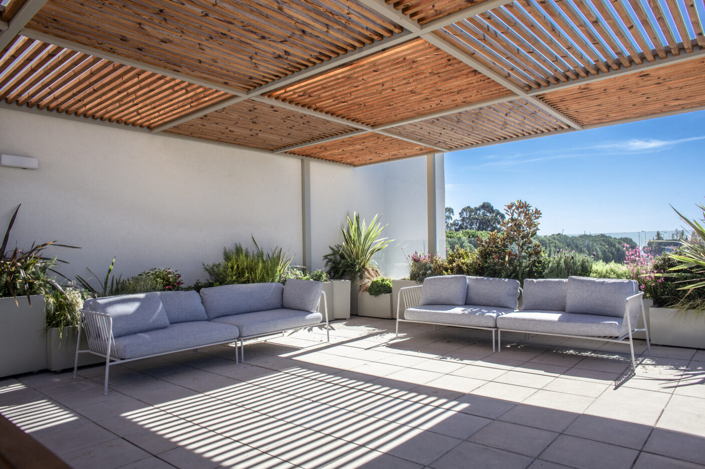 Para reforçar o conforto e a coerência estética do espaço, foram instalados bancos Horto Collection, igualmente desenhados à medida, com estrutura metálica lacada na mesma cor das floreiras e assentos em madeira natural. O conjunto é complementado por uma vedação metálica no mesmo acabamento e painéis de vidro de proteção a toda a volta do terraço, uma solução que garante segurança sem comprometer as vistas privilegiadas sobre a paisagem circundante.
