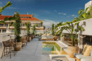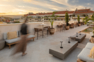No topo do edifício, o rooftop é um dos pontos altos da intervenção. Aqui, as floreiras Horto Collection, produzidas por medida em chapa zincor 1,5 mm e com acabamento personalizado, combinam-se com vasos em terracota, acolhendo Strelitzias, Dypsis, Yucca e Agaves. O resultado é um ambiente exótico e elegante, que prolonga a experiência EVOLUTION e transforma o terraço num refúgio verde sobre a cidade.