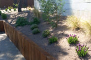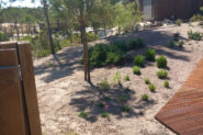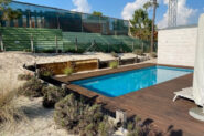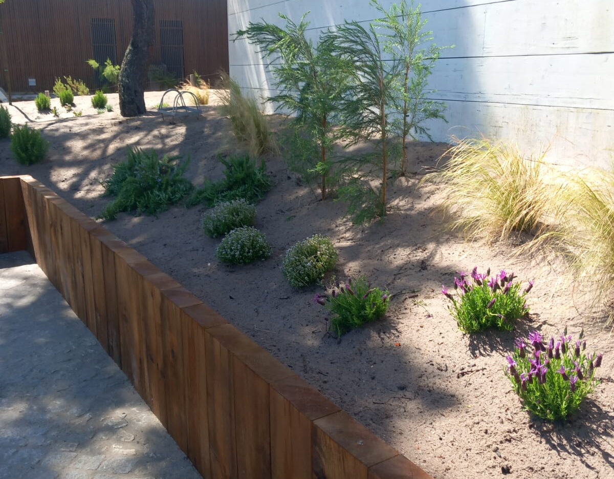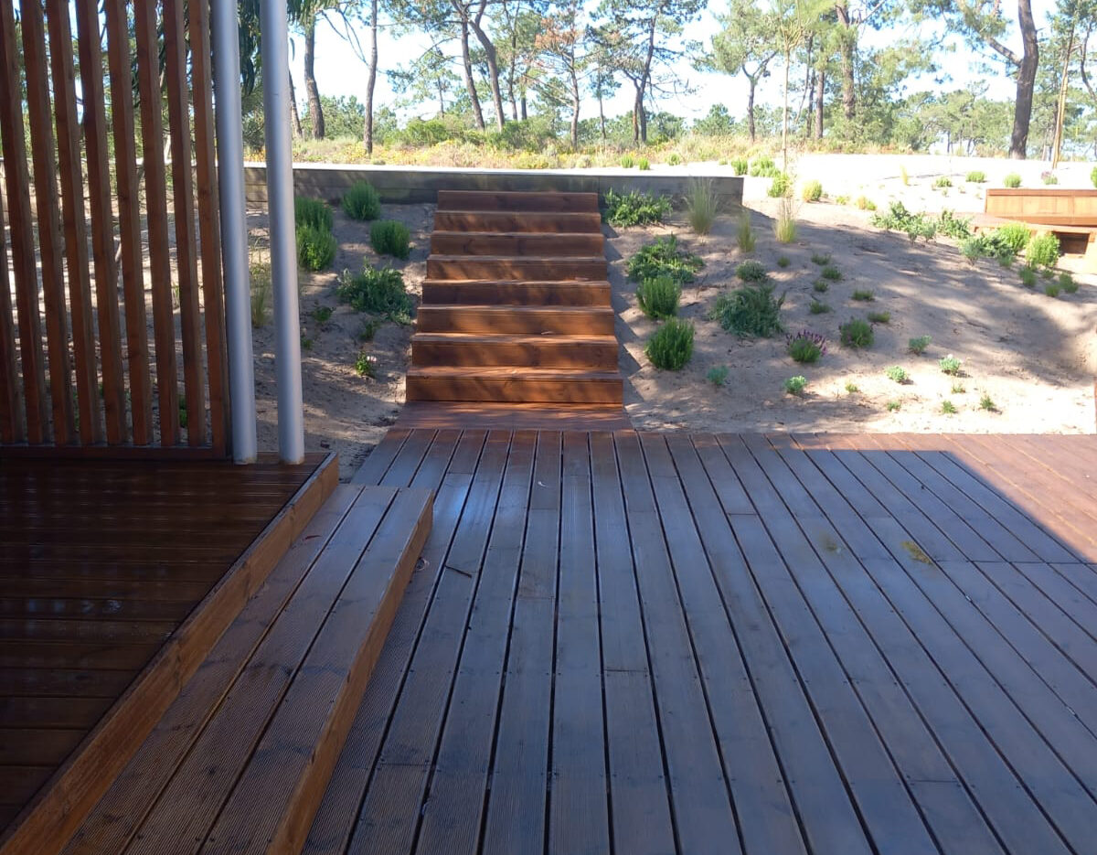 A intervenção privilegiou a permeabilidade dos pavimentos, recorrendo a materiais como areão e madeira, e reutilizando elementos existentes sempre que possível. Nos taludes, a estabilização foi conseguida através de vigas enterradas em V invertido, enquanto na zona “chill-out” foi criado um murete-banco contínuo em madeira, que prolonga o deck e acompanha a topografia. A instalação de um sistema de rega automatizado gota-a-gota enterrado assegura um consumo de água controlado, ajustado às necessidades das espécies e às variações climáticas.
