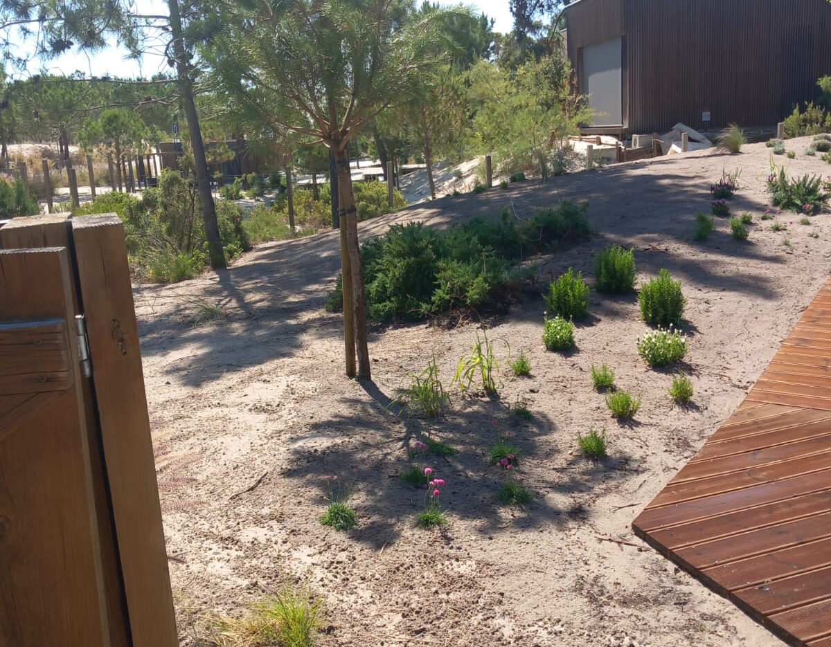Foi neste cenário de exceção que o Horto do Campo Grande foi desafiado a colaborar na requalificação do espaço exterior de um dos lotes residenciais do resort, a partir do projeto de paisagismo desenvolvido pelo arquiteto David Flores, do Atelier Biodesign. O objetivo passou por revitalizar o jardim e reforçar a ligação entre o espaço habitado e o ambiente natural, respeitando as características ecológicas da região e privilegiando soluções sustentáveis e integradas.