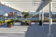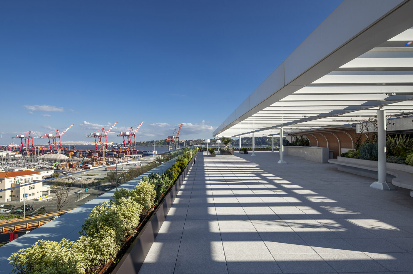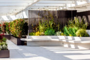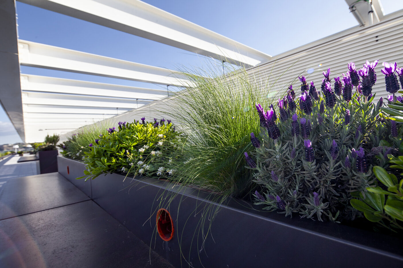 No rooftop, duas grandes floreiras com oliveiras e lavandulas marcam presença, enquanto canteiros com Abelia, Curio ficoides, Crassula, Phormium variegata, Pittosporum nana, Santolina e trepadeiras Trachelospermum jasminoides prometem, a curto prazo, cobrir pérgulas e oferecer frescura adicional.