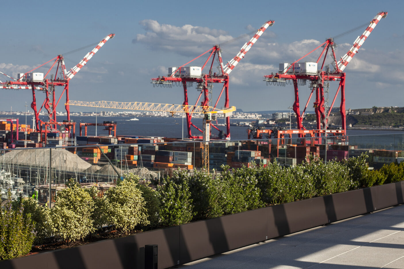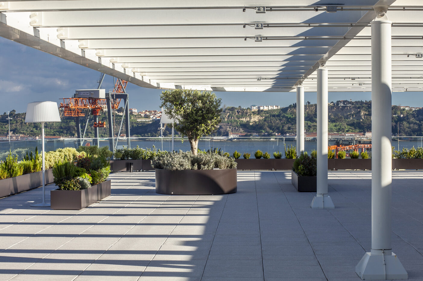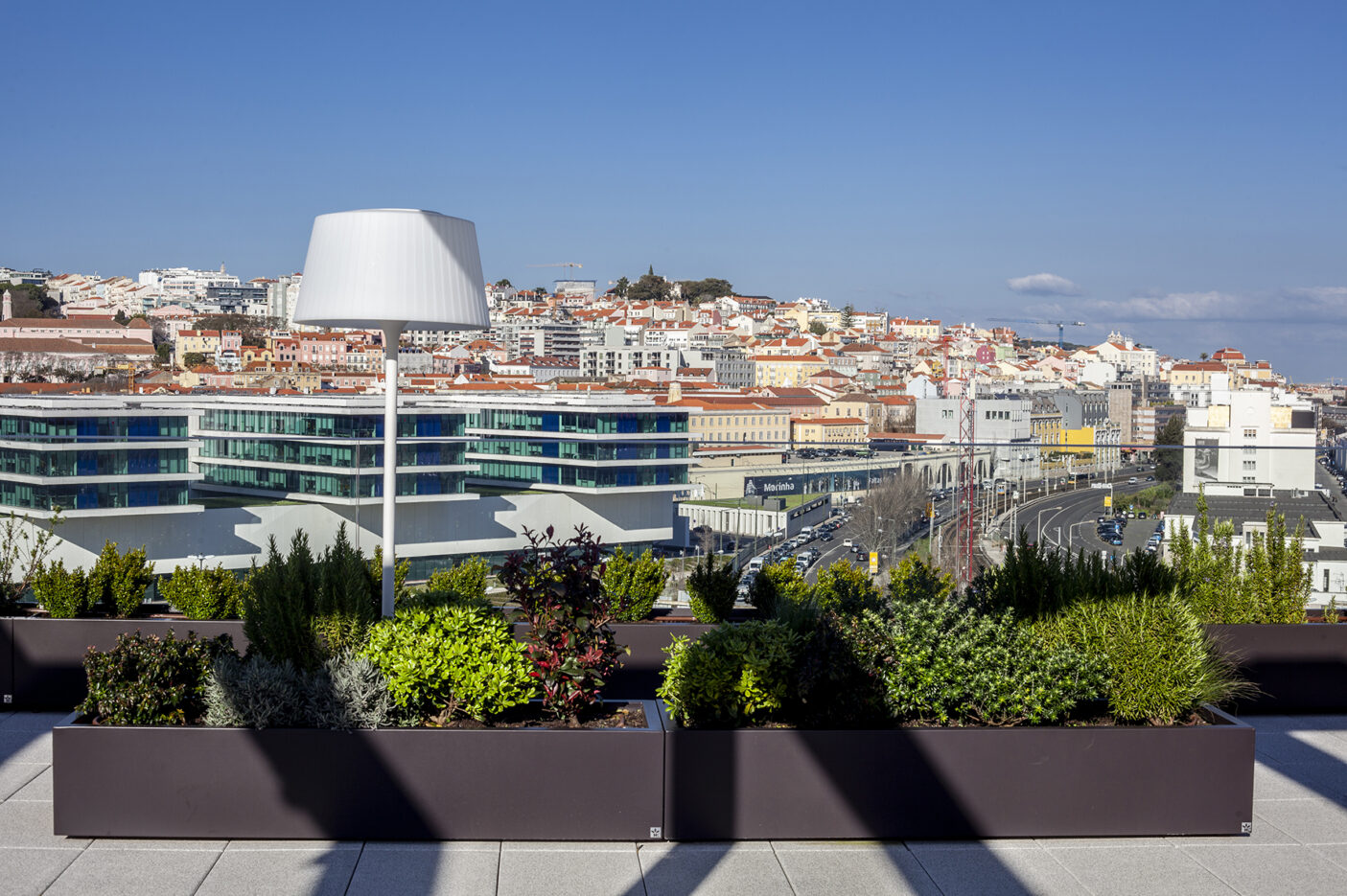 No exterior, a seleção privilegiou espécies autóctones e resilientes ao clima mediterrânico, com baixa necessidade de rega e elevada resistência. As floreiras Horto Collection foram preenchidas com Lantana, Loropetalum, Myrtus communis, Pittosporum variegata, Rosmarinus, Stipa e Westringia fruticosa, criando um conjunto de texturas e tonalidades de verde.