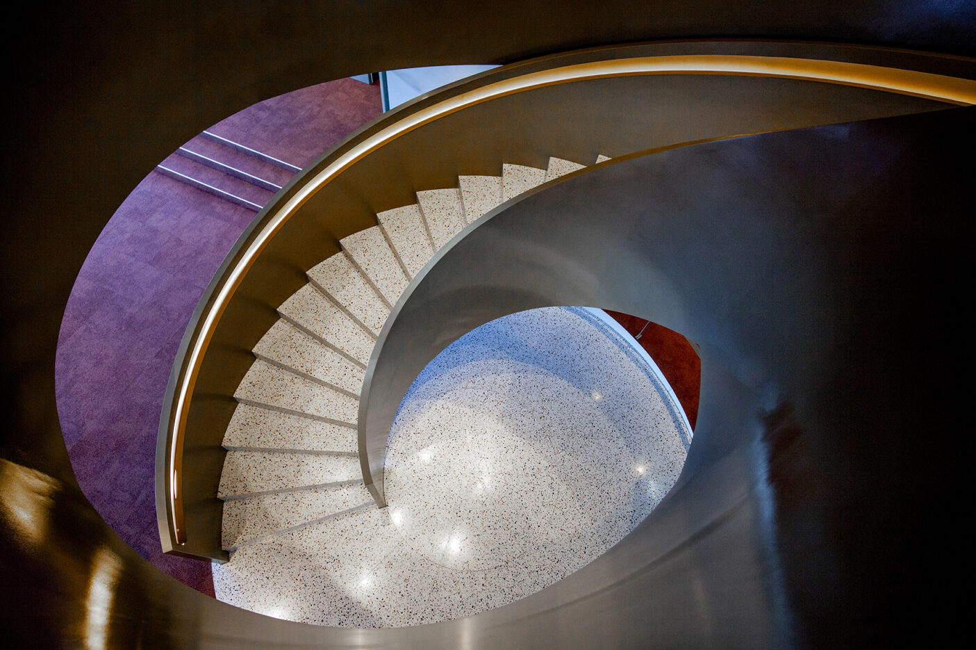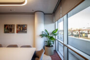 No interior, foram escolhidas espécies de grande impacto visual e adaptadas às condições de luz de cada espaço, como Ficus elastica, Kentia forsteriana, Monstera deliciosa, Phlebodium aureum, Spathiphyllum e Strelitzia nicolai. A sua presença, em floreiras metálicas da linha Horto Collection, personalizadas em forma, dimensão e cor, reforça a identidade do projeto e valoriza o mobiliário.